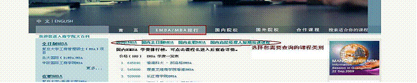 1、从网页上部可进入几大频道,他们分别是:EMBA/MBA排行榜、国内院校、国外院校、合作课程、搜索适合你的课程。